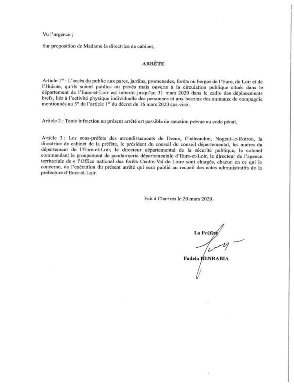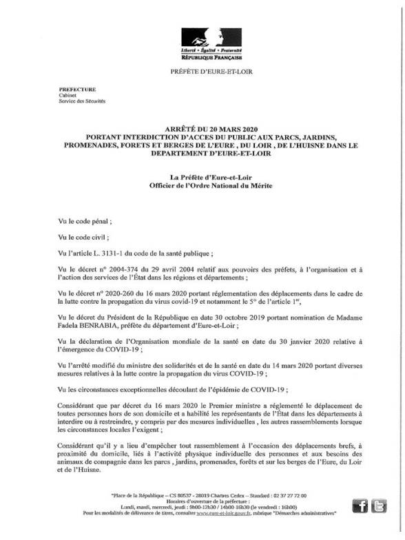 L'accès aux parcs, jardins, espaces ouverts au public est interdit. L'arrêté préfectoral du 20 mars 2020 :